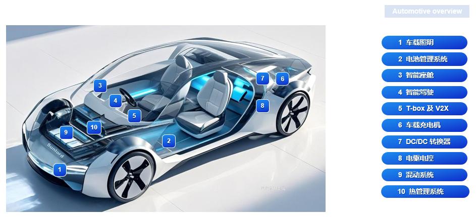 目前順絡汽車電子應用領域包含車載照明、BMS、智能駕駛、智能座艙、T-box&V2X、OBC、DC/DC轉換器、電驅電控、混動系統和熱管理系統,主要產品種類包括EMC元件、電感、變壓器、磁珠、熱敏電阻、LTCC、功率器件等。